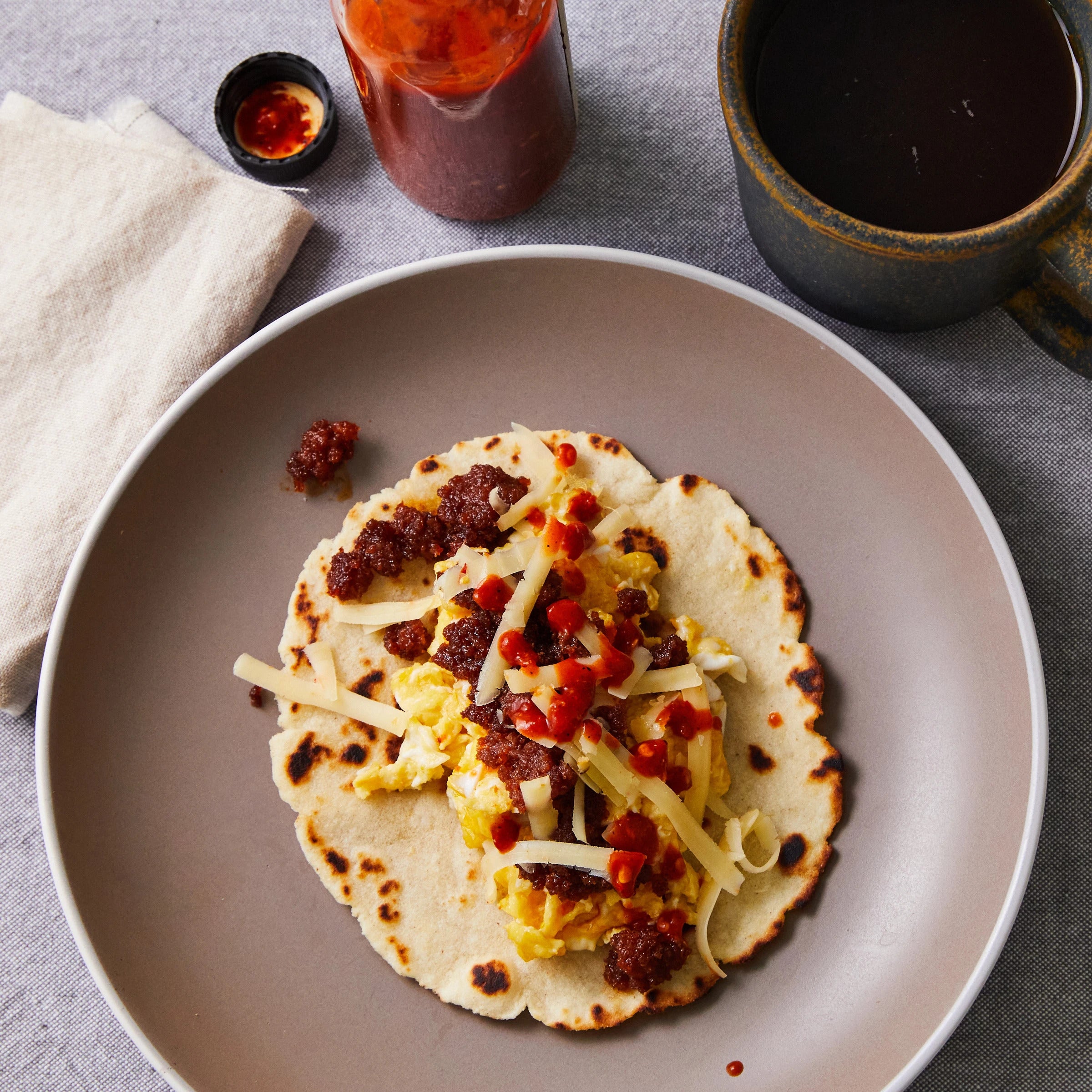 For this recipe, we love pairing the finished tortilla with shredded cheese, eggs and 'nduja spread for a unique spin on the breakfast taco.