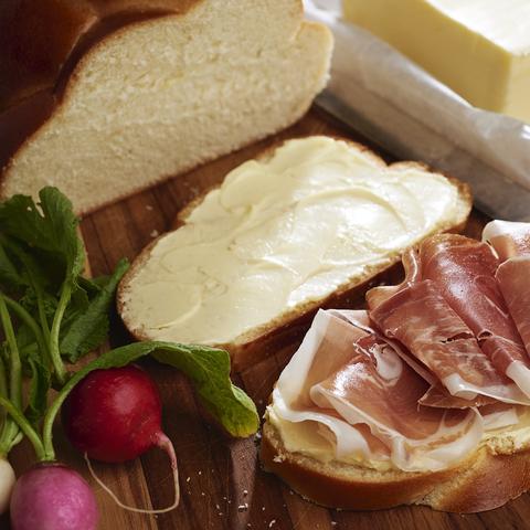 For each person, spread two slices of challah wall-to-wall with butter. Drape 3 or 4 slices of prosciutto onto the buttered bread. Top with the other slice of bread, butter side down. Gently flatten sandwich slightly to press all of the elements together. Enjoy or pack for later.